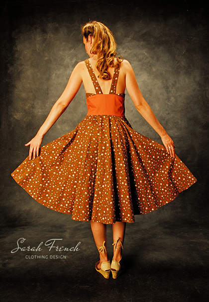 Perfect for swing dancing, this floral and polka dotted cotton dress is cut with a full circle skirt. There is also an attached coral underskirt with ruffle for extra fullness.